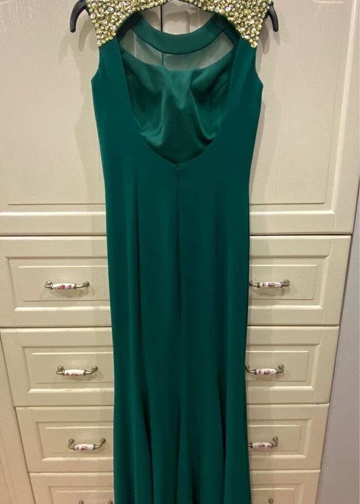 Ürün mezuniyet için bir kez giyilmiştir. Omzundaki taşlar kumaşa dikilidir,düşmez. Sırt dekoltesi vardır. Balık modeldir