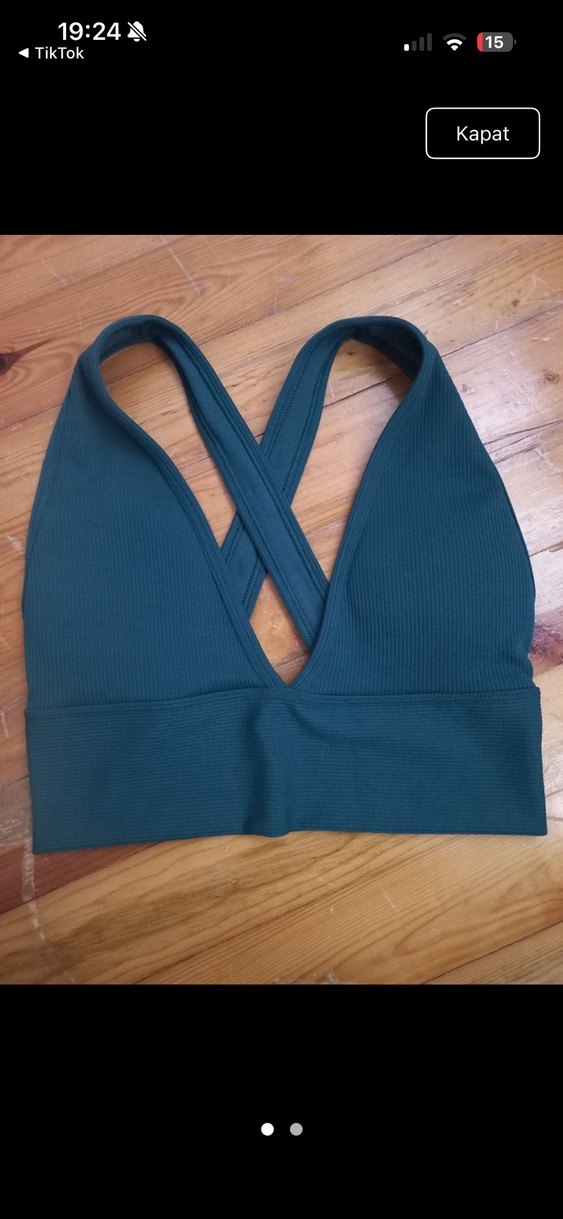 Koyu turkuaz renkli, çapraz askılı ve fitilli dokulu spor sütyeni. Sokak stili için uygundur, rahat ve orta kapama sağlar. Marka temsili