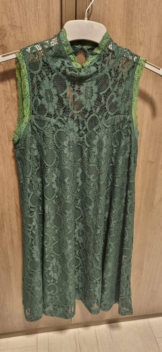 Kolsuz, zümrüt yeşili dantel elbise. Diz üstü boyda, bol kesimli bohem tarzında, romantik akşamlar için uygun.
