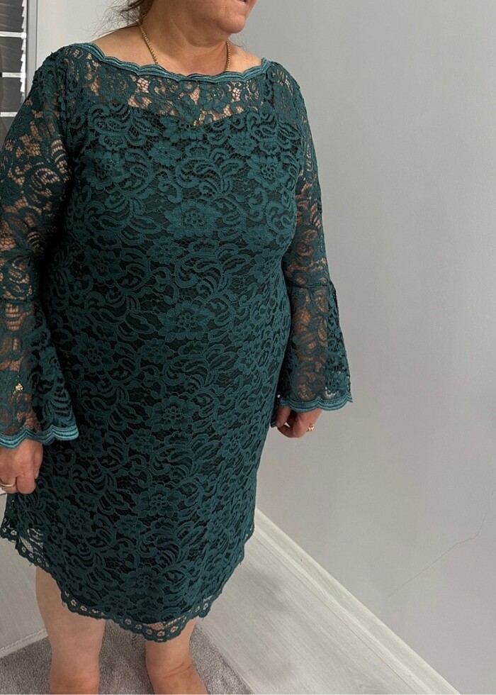 Şık ve zarif bir modeldir. Tamamı dantel kumaş, içi astarlıdır. Kayık yaka detayı ve ispanyol kol kesimi elbiseye modern ve zarif bir hava katar. Diz hizasında, dökümlü kesimi sayesinde rahat bir kullanım sunar ve vücut hatlarını belli etmez. Günlük şıklık ya da özel davetler için uygun 60 beden yazıyor fakat 50-56 beden tercih edebilir