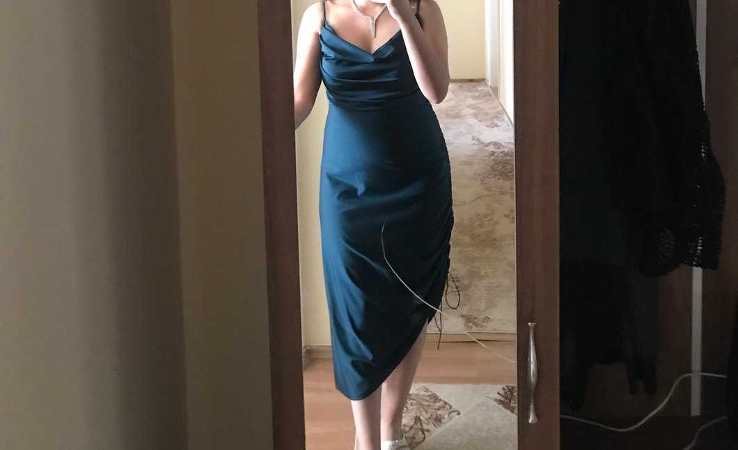 Zümrüt yeşili , V yaka, askılı ve drapeli detaylara sahip, midi boy şık ve vücuda oturan abiye elbise. minimal ve modern tarzda 2 farklı model oluyor