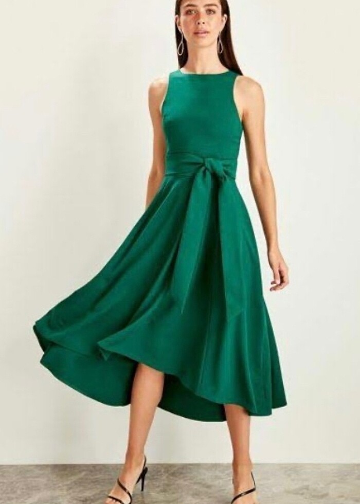 Trendyol s beden Zümrüt yeşili elbise Arkası uzun Önden 98 cm Arkadan 120 cm Kemer yok