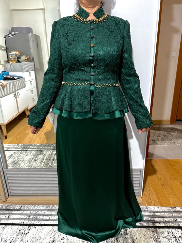 Fransiz güpürü dantelli zümrüt yeşili abiye etek ceket takım. Alvina’dan yıllar önce 4 bin liraya aldık. Annem kardeşinin nişanında giydi. Düğmelerinde solmalar var, isterseniz yenileyebilirsiniz. Teklifleri değerlendirebilirim.