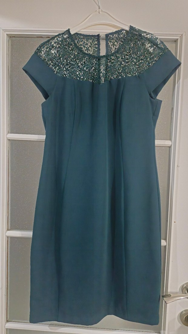 Parlak zümrüt yeşili renkli, kısa kollu ve bisiklet yaka midi elbise. Drapeli ve vücuda oturan kesimiyle düğün için uygun. ✨