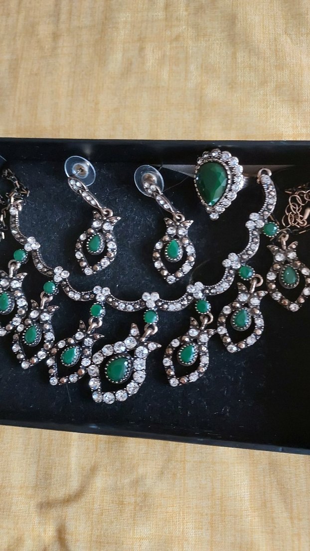 #Zümrüt yeşili kolye küpe yüzük takım. Tüm taşları yerinde çok güzel bir ürün. Yeşil taşlı, işlemeli ve payetli vintage tarzı kadın takı seti, bohem düğünlere uygundur.