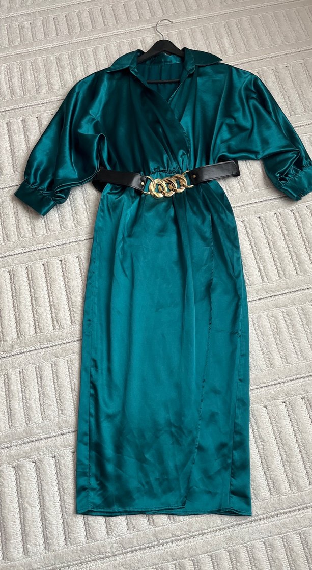 Yırtmaçlı detaylı zümrüt yeşilisaten elbise