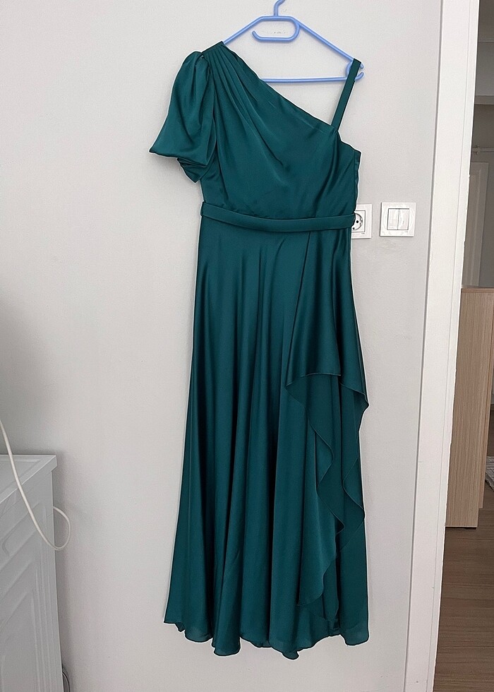 Zümrüt yeşili saten abiye elbise