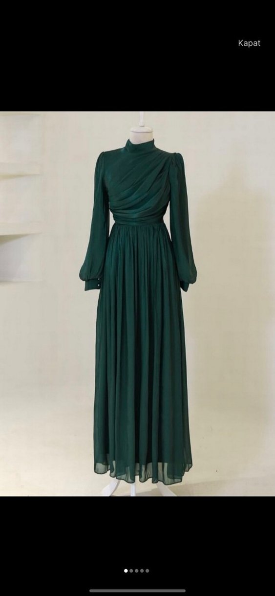 yakalı, uzun kollu, bol ve drapeli uzun yeşil tesettür abiye, düğünler için uygun. sadece birkaç saat giyildi bel kısmında çok hafif söküp gibi bir şey var ama gözükmüyor çok dikkatli bakılması gerekiyor şalıyla beraber gönderilecek Ben 3.000 liraya almıştım 44 beden de olabilir 2 si arasındaydı ben 180 cm 80 kg ile giydim