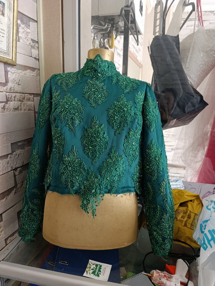 Yeşil renkli, yüksek yakalı, uzun kollu, drapeli ve işlemeli desenlere sahip kadın bluz. Parlak dokusu ve regular kesimi ile vintage bohem tarzda parti kıyafeti olarak uygundur. 44/46 bedene uygun sırtı ipli