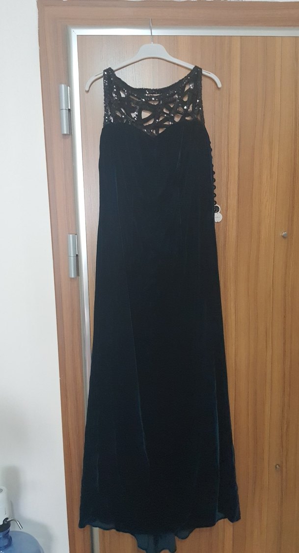 Zümrüt yeşili uzun, kolsuz ve V yakalı kadın abiye elbise. Dantel detaylı ve dökümlü kesim kadife kumaş pazarlık olur