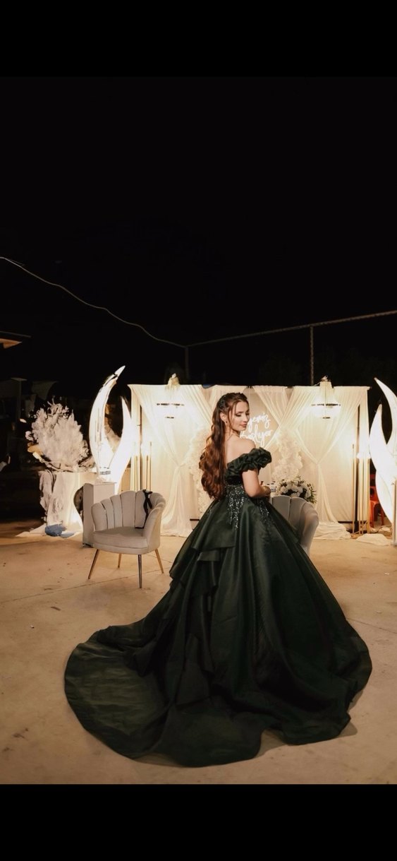 Zümrüt yeşili Uzun Kayık Yaka Gotik Nişan Elbisesi