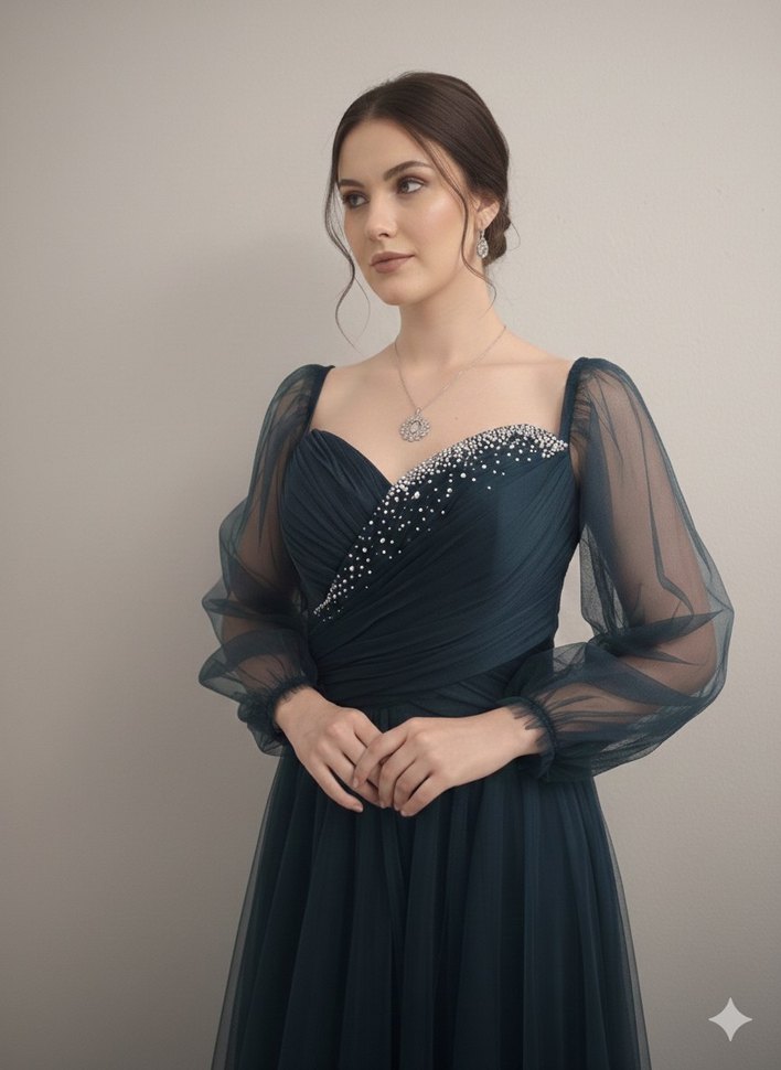 zümrüt yeşili uzun kollu abiye elbise, tül kollar, drapeli göğüs ve işlemeli detaylarla klasik ve zarif bir duruş sunar.