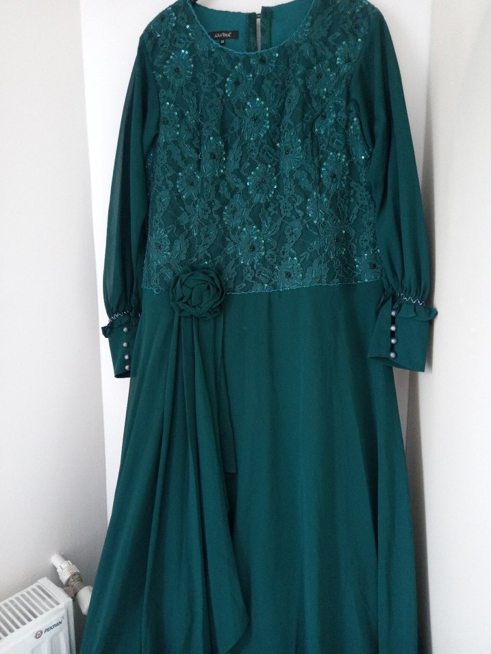 Zümrüt yeşili uzun kollu üst kısmı nakışlı Belde çiçek detaylı, bol ve drapeli kesimle tamamlanmıştır. yepyeni harika bir abiye ihtiyacı olan kaçırmasın