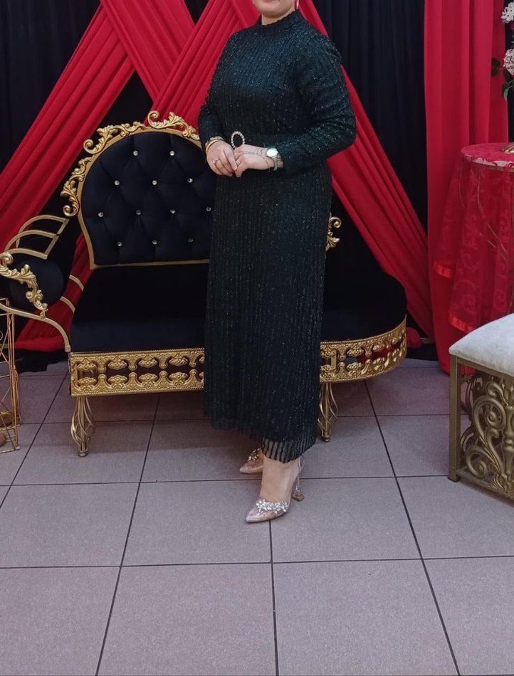 Zümrüt yeşili uzun kollu, yüksek yakalı ve piliseli desenli abiye elbise, klasik ve zarif bir görünüm sunar. 1 kere abimin kınasında giydim. temiz ve yenidir. Abiyenin şalı da dahildir birlikte verilecektir.