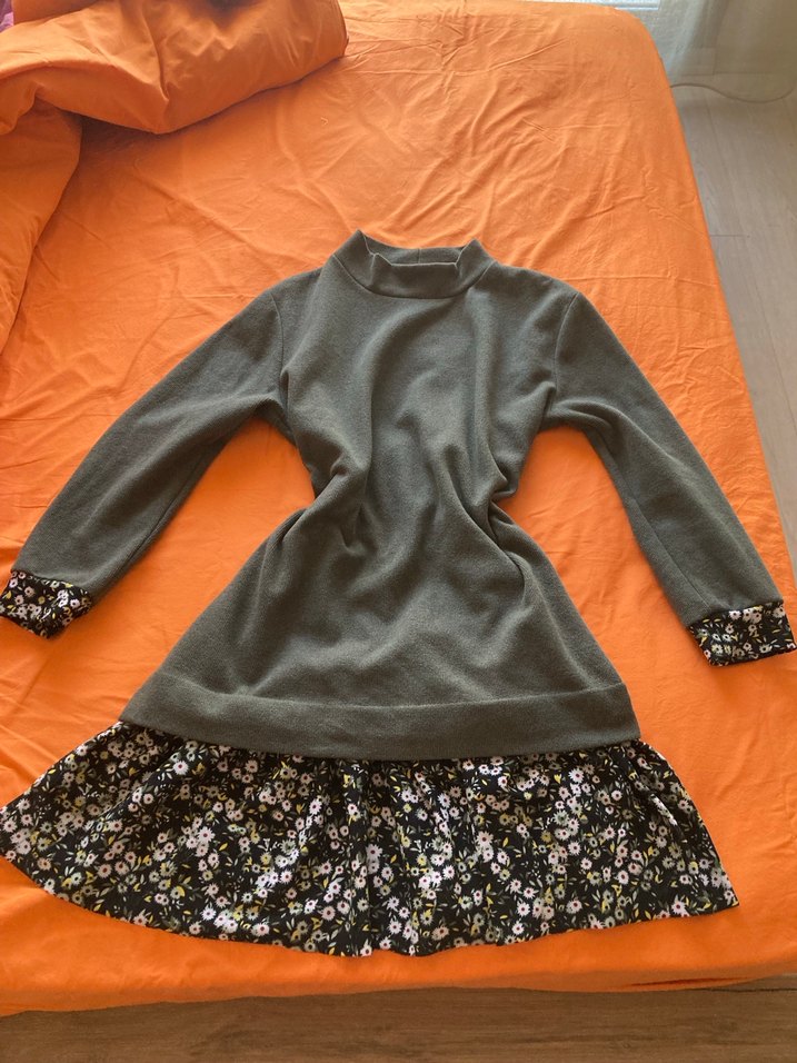 Zümrüt yeşili renkte, uzun ve bol kesim tunik, etek ve kol uçlarında fırfır detaylarıyla rahat ve sade bir tarz sunar.