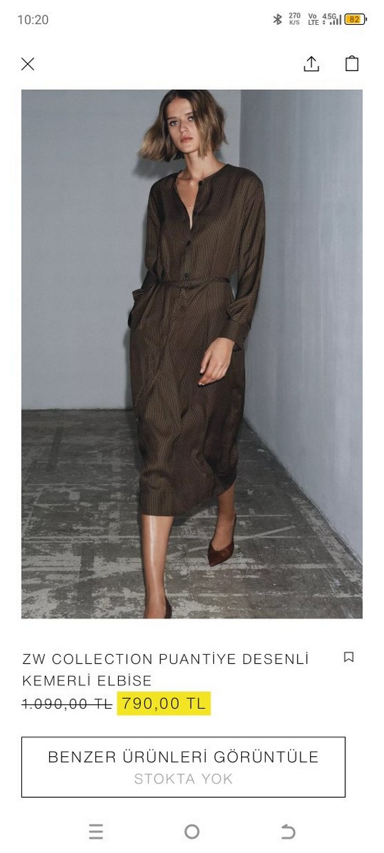 ZW Collection kahverengi uzun elbise, ince puantiyeli desenli ve kemerli. Uzun kollu, yakası kesik ve rahat kesimlidir. Günlük kullanıma uygundur.