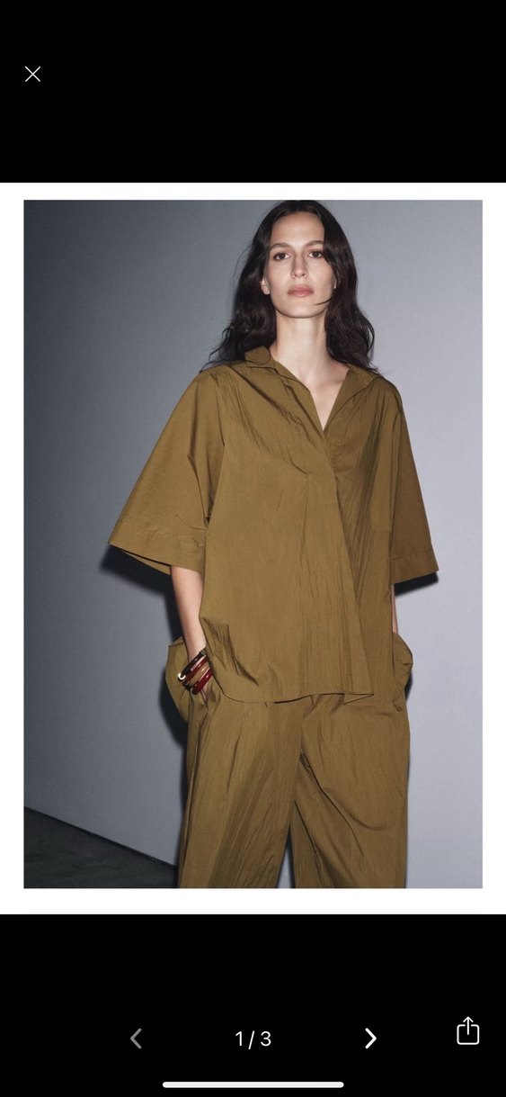 Kadınlar için geniş kesim, kısa kollu ve V yaka şeklinde tasarlanmış poplin bluz. Koyu haki renkte, minimal ve zahmetsiz şıklık sunar, günlük kullanıma uygundur. Bir kez giyildi. Xs beden bir takım, üst oversize olduğu için 36-38 bedene uyar