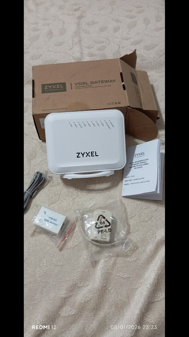 Çoklu gösterge ışıklarına sahip beyaz ZyXEL yazıcı modem, üzerinde TTNET logosu bulunur. ️