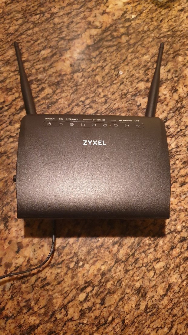 Zyxel siyah kablosuz modem, çift anten ve güç, DSL, internet, Ethernet, WLAN/WPS, USB göstergeleri ile donatılmıştır.